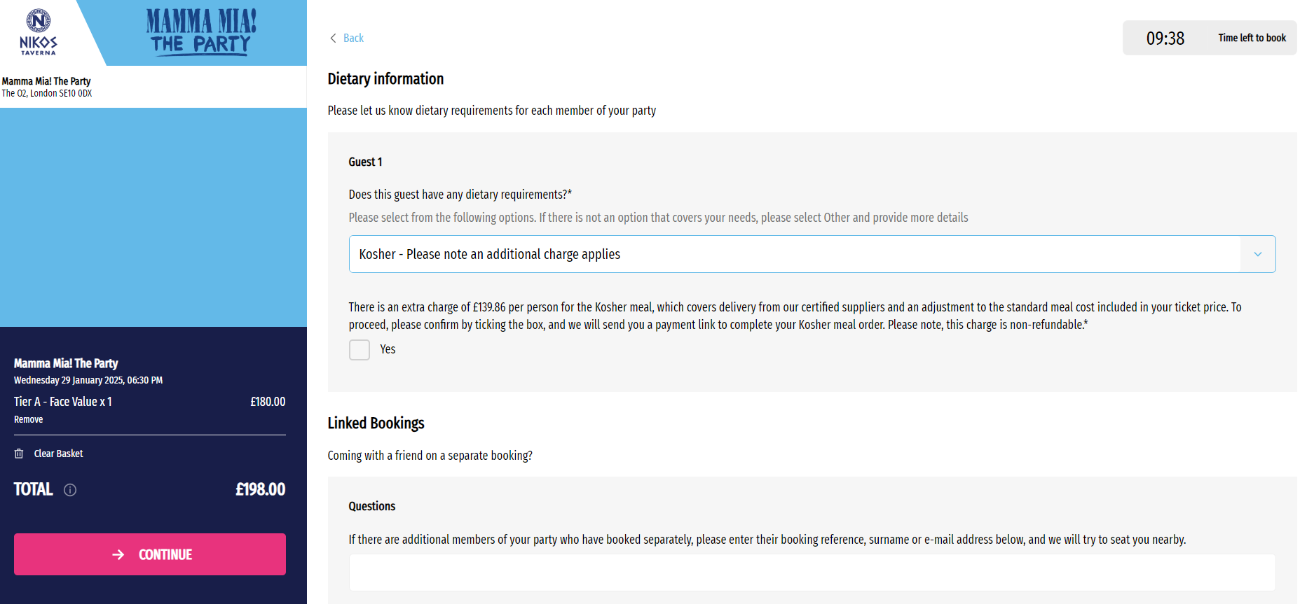 To order the Kosher option, please select from the dietary options that show after you have added your ticket to the basket (as illustrated below), tick the box to confirm you wish to add this option at £139.86 per person and continue to the end of the transaction.